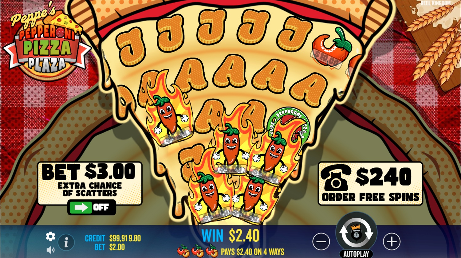 Set on 5 reels in a 2-3-4-5-6 configuration, players score winnings by landing at least 2 matching pepperoni symbols. For every other symbol, players must match at least 3 symbols.